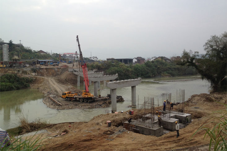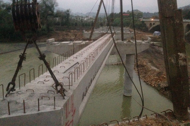 下午16時30分,公司下屬機(jī)械分公司副經(jīng)理朱超群、該項目部經(jīng)理汪承亮下達(dá)開始架梁的命令?,F(xiàn)場頓時掌聲雷動,禮花飛舞。在雙滑輪組的勻速滑輪中,空心板梁被緩緩?fù)扑偷轿?,徐徐降落固定,?jīng)過近40分鐘的精心操作,S347炎陵石潮至壟下公路新河漠大橋4#-5#墩5-3#空心板中梁順利架設(shè)成功。