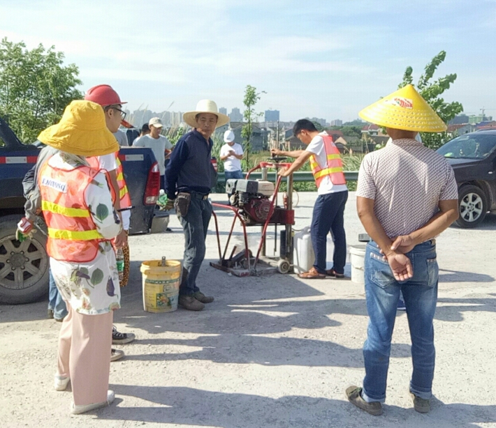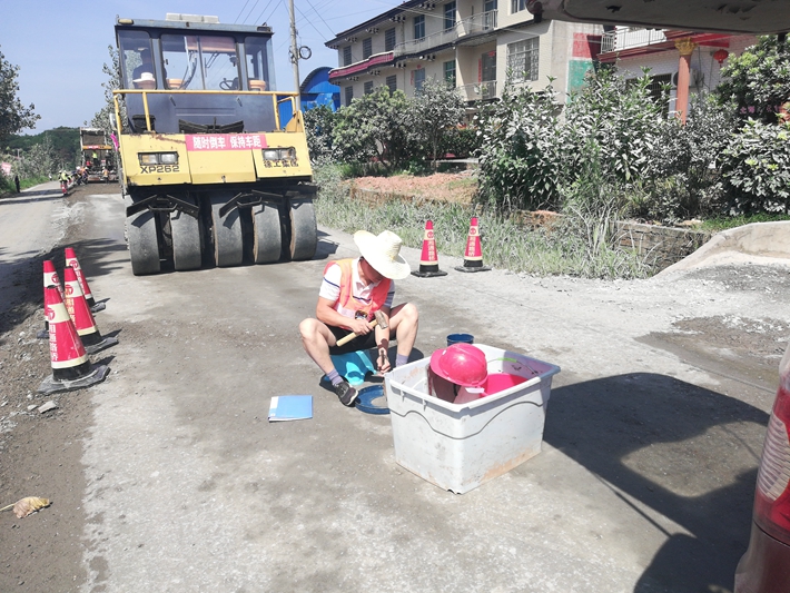 三是檢測環(huán)境惡劣。從6月份開始茶陵地區(qū)進入持續(xù)高溫期,最高溫度達39℃,路面溫度最高達到47℃,施工現(xiàn)場驕陽似火,熱浪滾滾,衣服濕了又干,干了又濕。