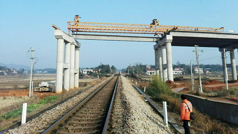 K38+250仁橋大橋為新建跨鐵橋梁,共16跨,該橋與既有益湛鐵路線交匯,其中第9孔35米箱梁上跨既有線(施工等級Ⅱ級),第10孔為臨近既有線(施工等級Ⅲ級)。設計孔跨為35米箱梁,單片箱梁最大重量為112噸,施工采用180T架橋機跨線架設。