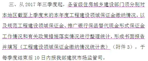 住建部發(fā)布建辦市函[2017]460號文,明確要求各省級住房城鄉(xiāng)建設部門須每季度要把推廣銀行保函替代現(xiàn)金形式保證金工作情況和有關政策措施落實情況進行整理統(tǒng)計,形成書面報告,進行上報,明確要求各省要加快推廣銀行保函替代現(xiàn)金形式保證金